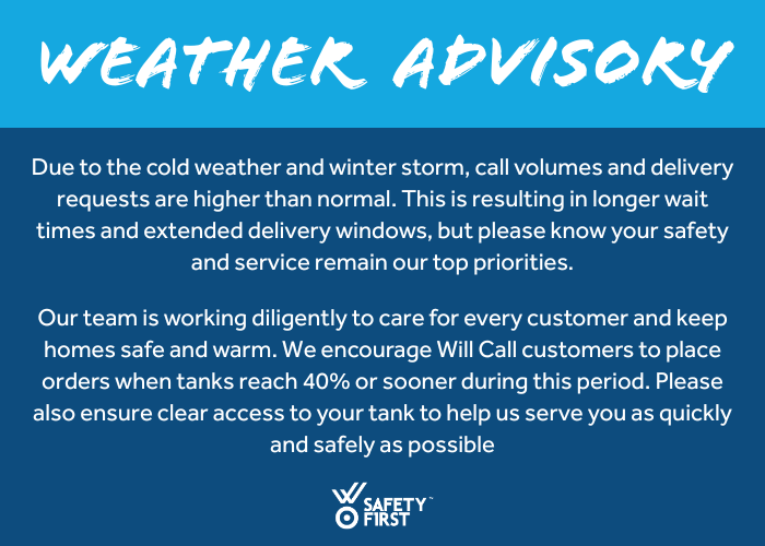As a Will Call customer, please be aware that running out of propane require additional steps for your safety, including a mandatory leak check and re-lighting of pilots. These services must be completed while someone is home.